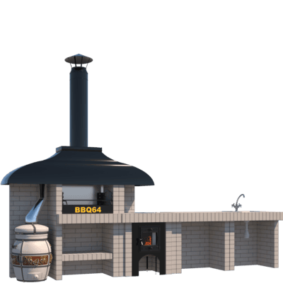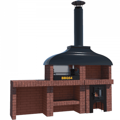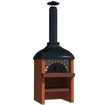 Мангал – это самый популярный элемент печного комплекса барбекю из кирпича, потому что предназначен для приготовления шашлыка и множества других вкусных блюд. Основание и стенки топки выполнены из красного керамического кирпича. Металлический дымосборник состоит из двух куполов: рабочего толщиной 1,5-2 мм и декоративного с покрытием эмалью. Дымоход выполнен из двустенного сэндвича с утеплением и закачивается оголовком-искрогасителем. Дополнительно возможно установить шибер для регулировки процесса горения. В топку встраивается мангальная вставка с металлом 3 мм, которая футерована шамотным кирпичом и имеет несколько уровней рамки для шампуров. Задняя стенка защищена нержавеющим фронтальным экраном-отражателем для избежания перегрева задней стенки топки. Таким образом, мангал можно топить не только углем, но и дровами.
